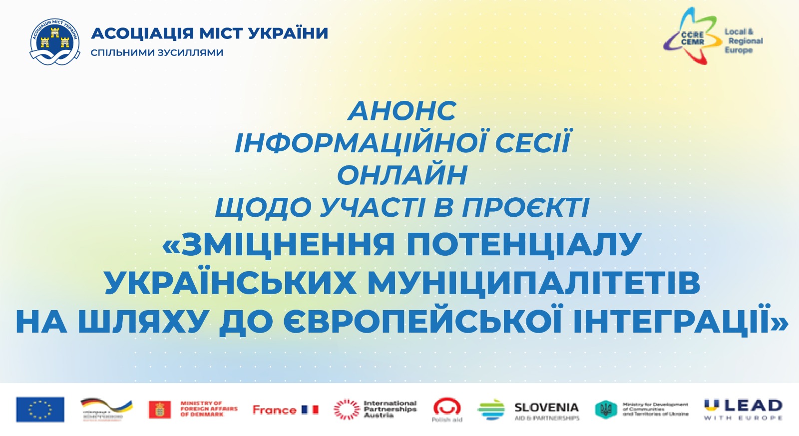 Інформаційна сесія проводиться в межах співпраці Асоціації міст України з Радою європейських муніципалітетів та регіонів (CEMR) та Програмою «U-LEAD з Європою» в межах спільноти «Мости довіри», що впроваджується за підтримки Європейського Союзу і його держав-членів: Німеччини, Данії, Франції, Австрії, Польщі та Словенії.