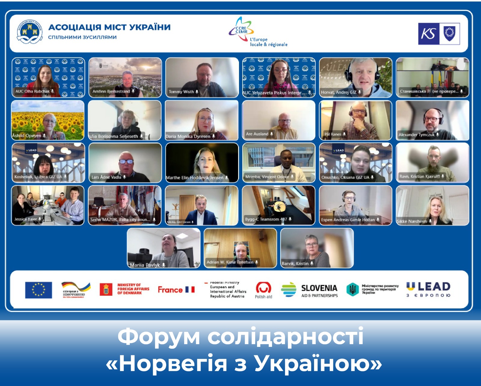 Форум солідарності «Норвегія з Україною» відбувся 12 березня 2026 року онлайн за організації Ради європейських муніципалітетів та регіонів (CEMR) у партнерстві з Асоціацією міст України та Норвезькою асоціацією місцевих та регіональних органів влади (KS) за підтримки Програми «U-LEAD з Європою».